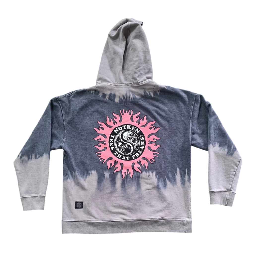 Buzo de frisa rustica oversize con capucha con proceso de lavado batik. Estampa en serigrafia. Lleva canesu en la espalda.
