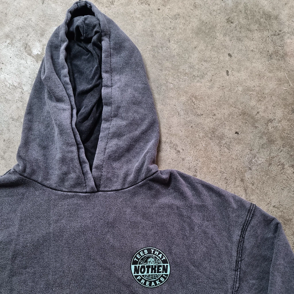 Buzo de frisa rustica oversize con capucha con proceso de gastado acid process. Estampa en serigrafia. Lleva canesu en la espalda.